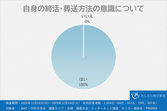 「あなたは自身の終活・葬送方法を意識し始めていますか?」と質問したところ、60代・70代全ての方が、「はい(意識している)」と回答されました。