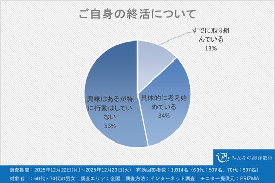 そこで今回、『みんなの海洋散骨(https://sankotsu-umi.com/)』を運営する株式会社Aクルーズは、全国の60代・70代を対象に、「高齢層における終活・葬送方法の意識と海洋散骨の認知・イメージ・利用意向」に関する調査を実施しました。