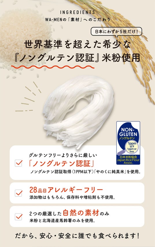 本製品は国内でも数少ない「ノングルテン認証(1ppm以下)」を使用し、小麦アレルギー対応と日本の米農家支援という二つの社会課題解決を目指します。