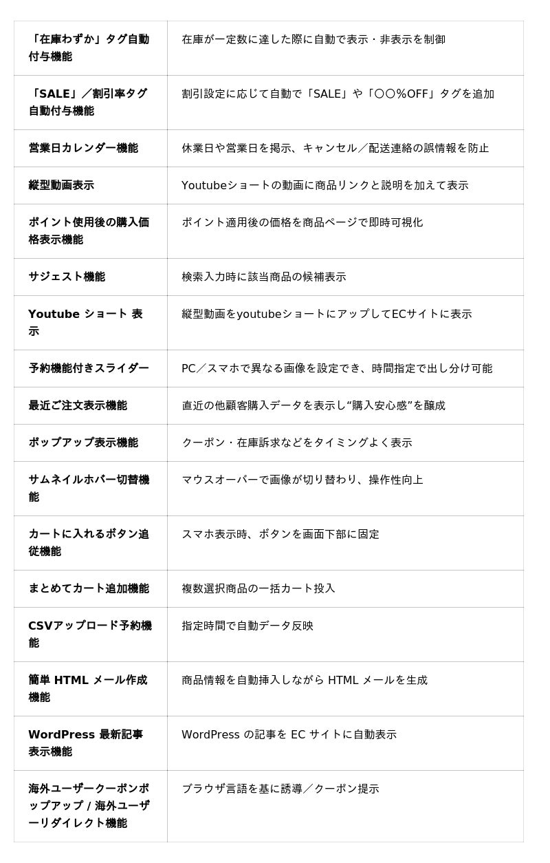 ブラザーズ株式会社futureshop専用拡張として、タグ自動付与や予約スライダーをはじめとする20種以上の機能をワンプライス・追加費用なしで提供。ECサイトの購買体験を強化する多彩な機能を、導入しやすい形で実現します