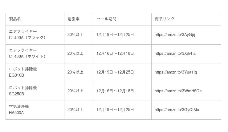 https://twitter.com/Ecozy_JP/status/1601167707738869760 活動3:クリスマス期間限定セール、全品20%以上!12月16日から12月25日まで、エコジーの商品がアマゾンにてクリスマス限定セールを続々実施します。大切な彼氏、彼女、子ども、友達、家族、そして一年中頑張った自分にも、毎日の生活を便利にするエコジーの家電製品を贈ろう。