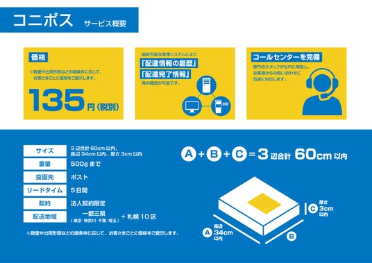 株式会社地区宅便(セイノーグループ、セイノーラストワンマイル株式会社100%子会社、代表河合秀治)は、ポストイン配送の新サービス「コニポス」のプレセールスを2024年3月31日をもって終了し、2024年4月1日より商品重量(300gまでを500gまで)及び、配送エリア(一都三県+札幌市10区)を拡大し、1個135円で提供を開始いたします。