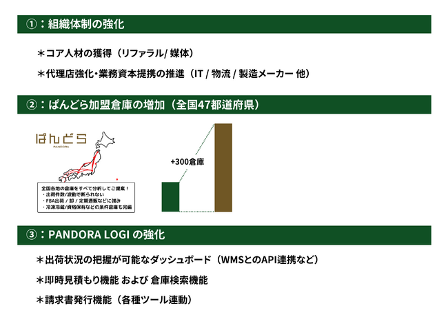 1:組織体制の強化:特にD2Cと物流の双方領域に知見と経験を持つコア人材の獲得に取り組みます。 →ぱんどら社の採用についてはこちらから(https://pandora.style/lp/contact)2:当社加盟企業拡大:営業活動、販促網を広げるためのマーケティング費用に充当します。3:「PANDORA LOGI」の機能拡充:EC事業者と物流倉庫が利用する「PANDORA LOGI」機能開発に充当します。情報を入力するだけで全国の物流倉庫から即時自動見積もりが表示される機能の実装や、物流倉庫の請求書発行業務を効率化するためのAPIによる自動計測システムなどを追加していく予定です。ぱんどら社は今回の資金調達を経てさらに認知を拡大させ、EC事業者の潜在的な損失を未然に防ぎ、3PL事業者に対して最高効率の案件提供ができるよう進めてまいります。
