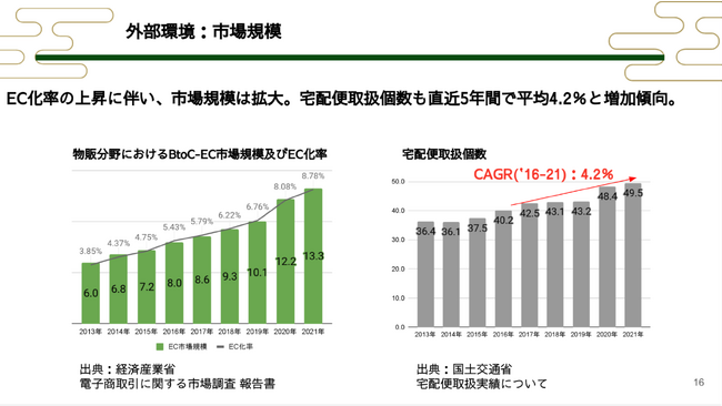 物販分野におけるEC市場は年々増加傾向にあります。それに比例し宅配便取扱個数も増加、さらに配達方法や物販の種類の多様化が進んでいます。