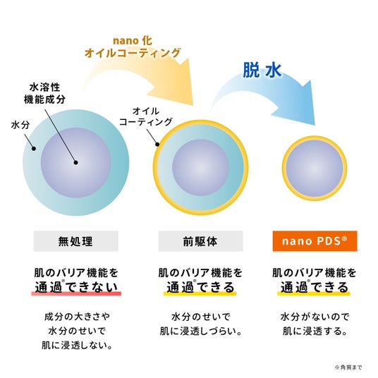 しかし、ナノ化した成分をオイルコーティングして脱水するnanoPDS(R)︎の技術を使えば、皮脂膜に覆われた肌表面、および角質間にある細胞間脂質によるバリア機能を通過させる(角層まで)ことができるようになります。