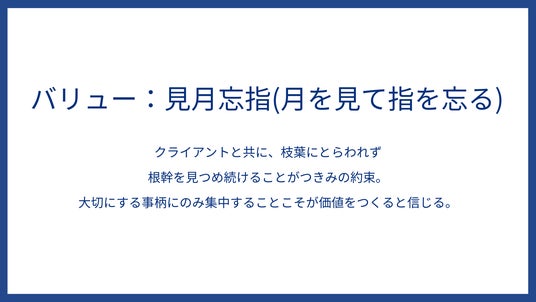 見指忘月(指を見て月を忘る)という禅の教えがあります。月を示そうと指さしても、人は肝心の月を見ず指だけ見るという本質を理解せず、文字や言葉の端々にこだわってしまうことがあるという教訓です。私たちのその逆を目指すという想いを込め、月と指を逆転させた造語をバリューとしました。