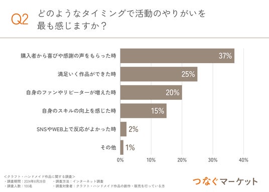 「購入者から喜びや感謝の声をもらった時(37.0%)」「満足いく作品ができた時(25.0%)」「自身のファンやリピーターが増えた時(20.0%)」という回答が集まりました。