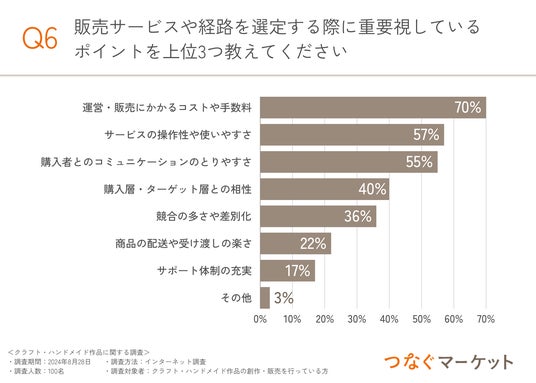 「運営・販売にかかるコストや手数料(70.0%)」「サービスの操作性や使いやすさ(57.0%)」「購入者とのコミュニケーションのとりやすさ(55.0%)」という回答が集まりました。