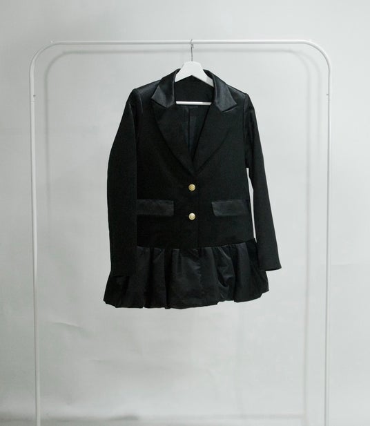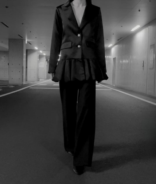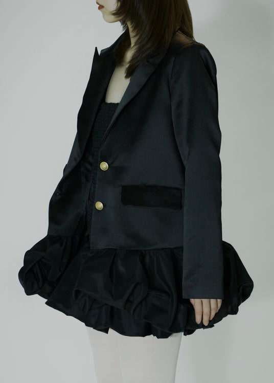 ジャケットの裾にバルーンシルエットを取り入れ、立体感とエレガンスを両立しています。