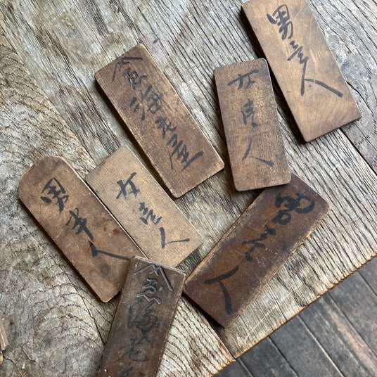 当時、男壱人(おとこひとり)・女壱人(おんなひとり)は、1日働いた際、または半日・午後だけ出勤した際、タイムカードとして「勤労木札」を受け取り、勤怠管理を行なっていました。店主側は、月末にまとめ「勤労木札」の量を計算し、奉公人にお給金を支払っていました。