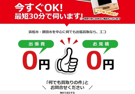 エコは浜松市東区にある出張買取業者で、生活家電や家具といった家庭用品はもちろん、厨房機器やDIYに活躍する工具類まで、幅広いジャンルに対応しています。
