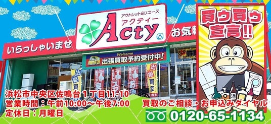 アウトレット&リユースショップのアクティー佐鳴台本店は、浜松で買取NO.1を目指す地域密着型買取・販売店です。家電(特に冷蔵庫・洗濯機は地域No.1の品揃え!)、家具、自転車、お酒、工具など幅広く高価買取。出張買取と店頭買取に対応し、買取査定は無料。もちろん出張買取時にも手数料はかかりません。