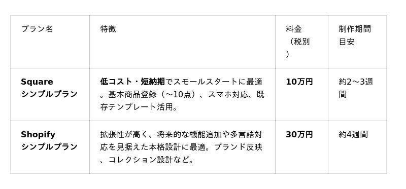 本事業では、SquareおよびShopifyを活用したECサイトの制作・運用代行に加え、代表 亀井による