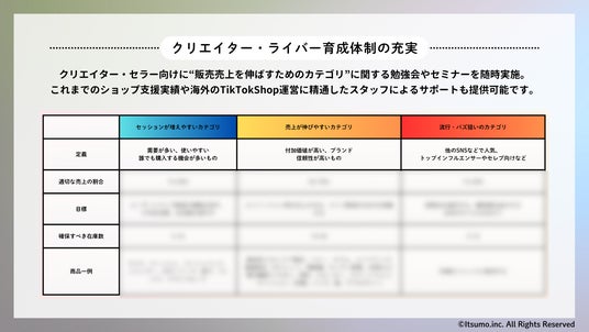 クリエイター・セラー向けに“販売売上を伸ばす”ための勉強会やセミナーを随時実施しています。これまでのショップ支援実績や海外のTikTokShop運営に精通したスタッフによるサポートも提供可能です。