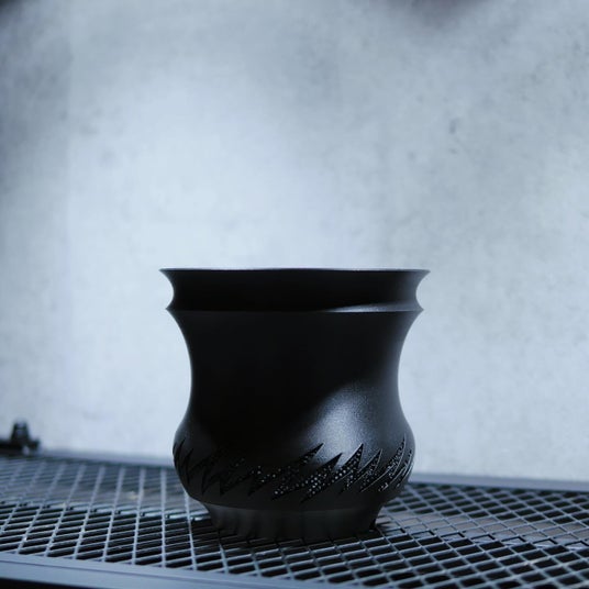 サイズ:4号(外寸 約φ120mm × 高さ 約110mm)【商品の魅力】鋭いエネルギーをまとった新シリーズ。POT THUNDER(サンダー) は、稲妻を思わせるシャープな3Dメッシュのスリットラインが象徴的なモデルです。黒の質感に刻まれた稲妻状ディテールが光を受けて陰影を生み、植物のフォルムに"鋭さ"と"力強さ"をプラスします。