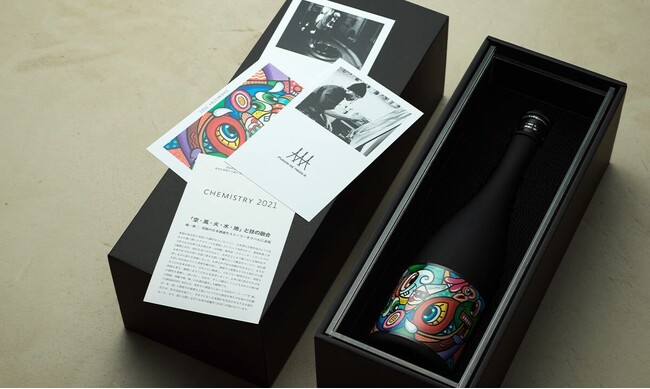 日本酒が芸術作品の1つであるとの強い想いとテロワールを重視するために、愛知県奥三河のお米に注目し、夢山水・山田錦・夢吟香・チヨニシキ・ミネハルカの5種類のお米をすべて使いました。お米本来の特性を最大限に生かすために各工程でお米の 磨き度合に変化を持たせ、お米1粒1粒が個性を発揮したことで 究極で唯一無二のお酒が誕生しました。 「CHEMISTRY 2021」のラベルには、お酒造りの重要な工程1つ1つでその使命を果たすお米の力に 「 空・風・火・水・大地 」を融合させ、化学反応を起こし 、今までにない日本酒生み出されるさまを描きました。また、絵には隠し文字でお米の収獲年「2021」が描かれています。