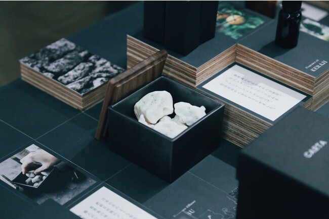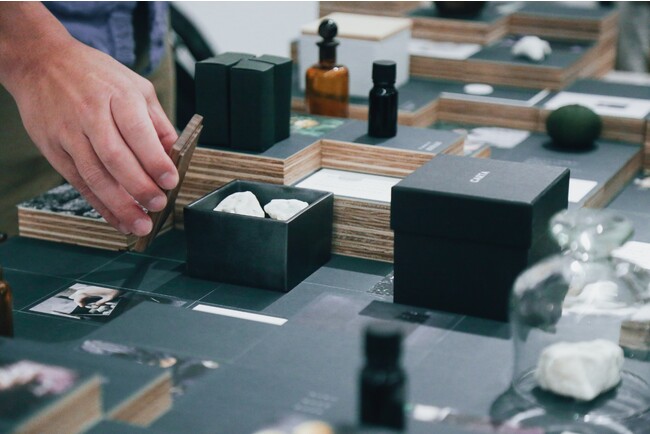 CARTAは、日本の地域の素材を使った香り、日本のクラフトフレグランスの会社です。社名は日本の百人一首の”かるた”から由来します。歌人たちが日本の風景を見て気持ちを歌ったように「心に浮かぶ日本の情景を守り、繋いでいく」という想いを込めています。展示のテーマはかるたの山。九州の福岡と宮崎を中心に活動するデザインチームYOKAがディスプレイデザインを担当。