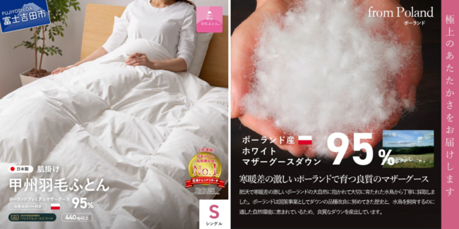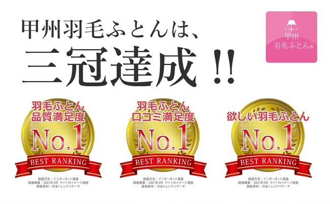 「羽毛ふとん品質満足度No.1」「羽毛ふとん口コミ満足度No.1」「欲しい羽毛ふとんNo.1」2年連続3冠達成。