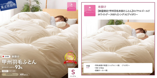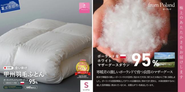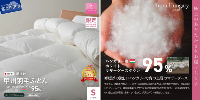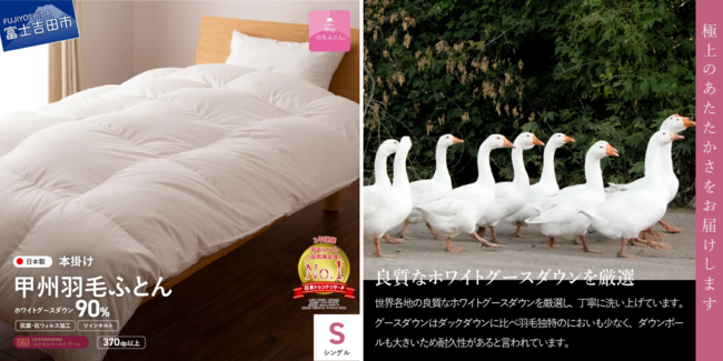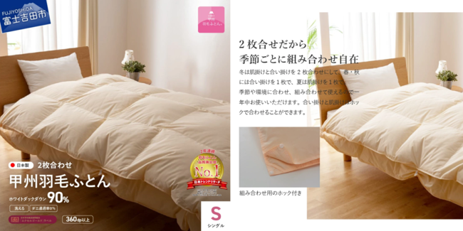 ◆【ふるさと納税返礼品】“選べる発送月”の魅力富士山の天然水で磨かれた羽毛を扱う、唯一の寝具ブランド"甲州羽毛ふとん"は、山梨県寄附金額5年連続No.1を誇る自治体の中でも大人気のふるさと納税返礼品。毎年、数万件のお申し込み実績がある寝具ブランドです。
