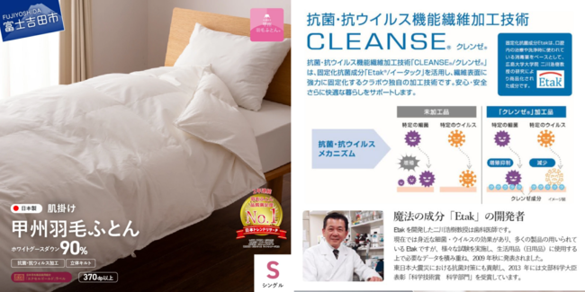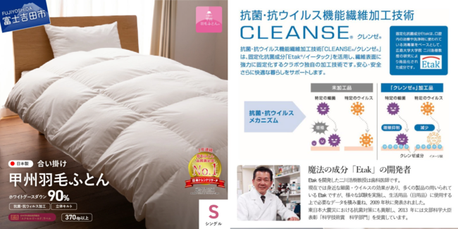 ▼寄付金額150,000円【甲州羽毛ふとん】抗菌・抗ウイルス加工羽毛2枚合わせふとん(シングル)