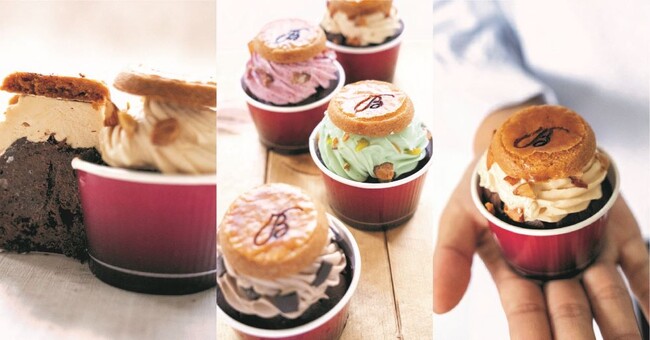 濃厚なブラウニー風チョコ生地の上にエアリーなバタークリームを絞り、TOPにバターサンドの