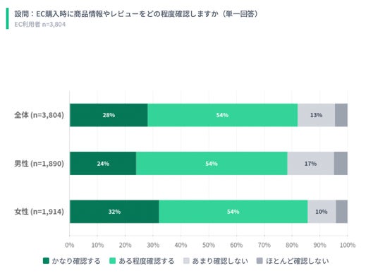 購入前にレビューを確認する人は82.0%に達し、特に女性や生活関連商品の購入においてその傾向が顕著でした。