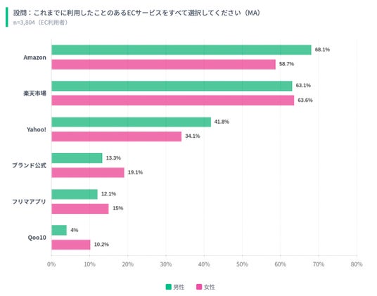 利用サービスではAmazonと楽天が突出し、合計で76%以上を占める結果となりました。