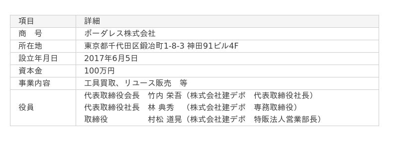 株式会社建デポ株式会社建デポ(本社:東京都千代田区、代表取締役社長:竹内 栄吾、以下、当社)は、2025年6月2日付けで工具買取専門店 Reツール を運営しているボーダレス株式会社(兵庫県神戸市東灘区、代表取締役:居石 浩一、以下、ボーダレス)の全株式の取得を完了し、完全子会社化したことをお知らせいたします。