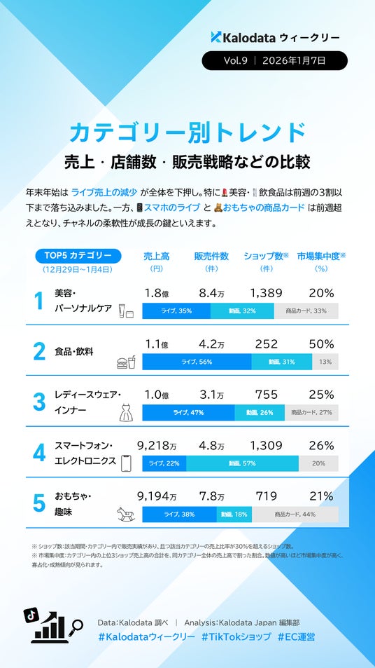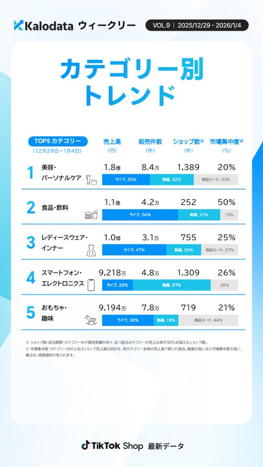 Kalodata Japan(運営:株式会社Kalowave Japan)の最新データ分析によると、2025年12月29日~2026年1月4日のTikTok Shop日本市場では、年末年始の影響によりライブコマースの稼働が一時的に低下したものの、