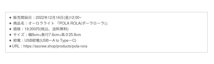 合同会社CREWAは2022年12月16日(金)に、自然現象であるオーロラを再現したインテリアライト POLA ROLA(ポーラローラ)を当社ECサイトにて一般販売を開始いたします。