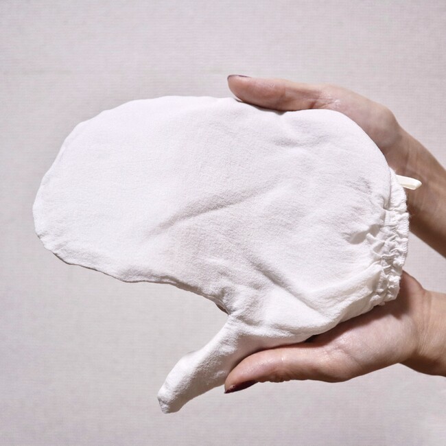 表面:凸凹のあるちりめん加工大小凸凹のあるちりめん加工を施しているため、ミクロ単位の重なった繊維がホウキのように水と油を優しく吸着し、細かな繊維で垢をからめとります。肌に直接あたる表側の生地は羽衣のような柔らかい極上シルク生地を使い、こするたびに角質をキャッチしやすくなっています。裏面:洗い加工を減らした生シルクを使用生シルクは洗い加工を減らし、加工薬剤を一切投与しない状態の為、肌に優しい天然のセリシンがたっぷり残っているのが特長です。2種類のシルク生地のミルフィーユ構造により、生地と生地の間に空気の層が生まれ泡立ちを良くしてくれます。肌に負担が少ないのに、しっかり汚れを落としてくれるしっとりとした洗い上がりを実感できます。