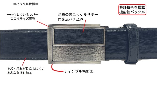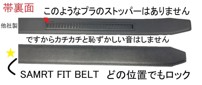 穴も無く、帯の裏面もスマートです!ベルト裏面にノコギリ型のストッパーも無く、操作時のカチカチと恥ずかしい音もしない、大変スムースな操作性を実現しました。