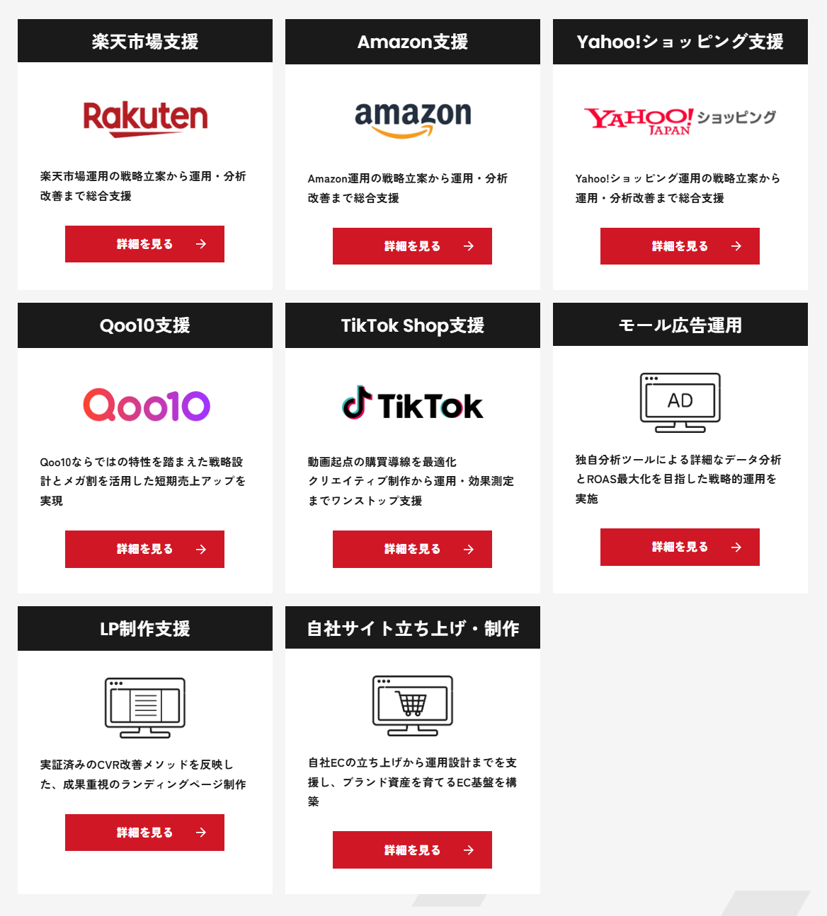 既存モールに加え、新興チャネルや広告・制作領域まで対応範囲を明確化し、EC事業者の成長段階に応じた柔軟な支援体制を可視化しています。