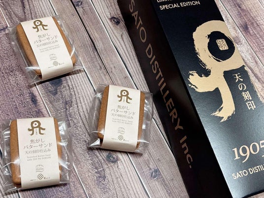 バターサンド専門店「菓te-ri(カテーリ)」(宮崎県椎葉村)は、佐藤焼酎製造場(宮崎県延岡市)が手がけるクラフトウイスキー「天の刻印」を使用した新商品「焦がしバターサンド〈天の刻印仕込み〉」を発売いたします。