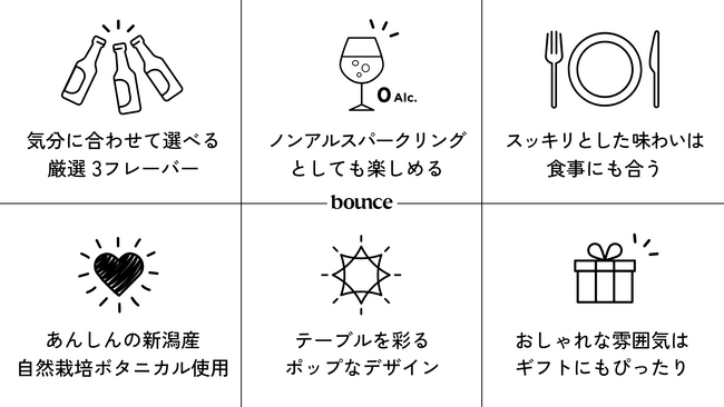 株式会社bubbly (本社: 東京都渋谷区、代表取締役CEO: 中島圭祐) は、ボタニカル炭酸水「bounce (バウンス)」の一般販売を2023年5月2日(火)より自社ECサイト「bounce online store」にて開始いたします。bounceは「余計なものから解放される爽快感」を味わえる天然フレーバーのスパークリングウォーター。砂糖・合成香料・甘味料・保存料・着色料を一切使用せず、農薬・肥料に頼らない自然栽培で育んだボタニカルハーブが彩る香りと、心透きとおる味わいをお楽しみいただけます。応援購入サービス「Makuake」での先行販売では、7日間で1,500本が完売しました。