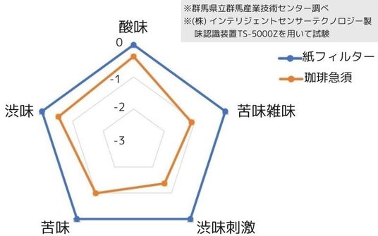 同条件でコーヒーを淹れ、味覚センサー試験を実施しました。渋味・雑味などが抑えられ飲みやすくまろやかな味になっていることがわかります。