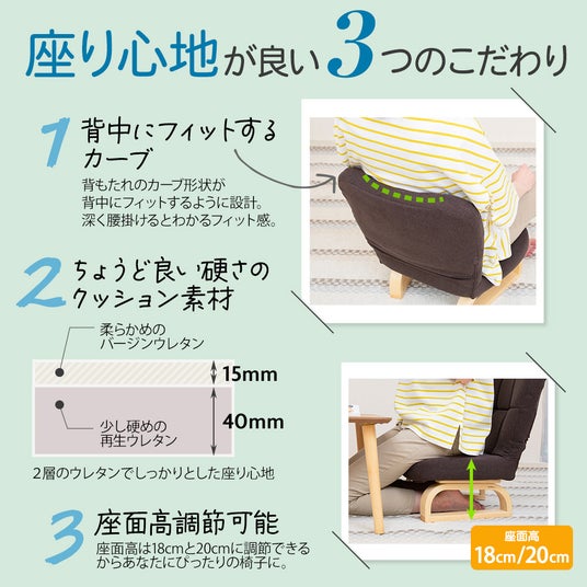 座面が体重を支えてくれるので、あぐら座りや正座の時の脚への圧迫感が軽減され楽に座る事が出来ます。