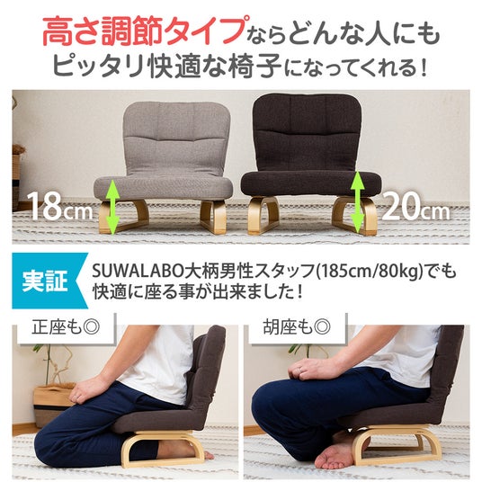 楽になるとの意見も頂きました。すべての人が快適に座れる椅子を目指し、高さ調節タイプが生まれました。2cmの調節ですが、この2cmで大柄な男性でも楽に正座する事が出来るようになりました。小柄な女性は低めの設定をすればぴったりに。