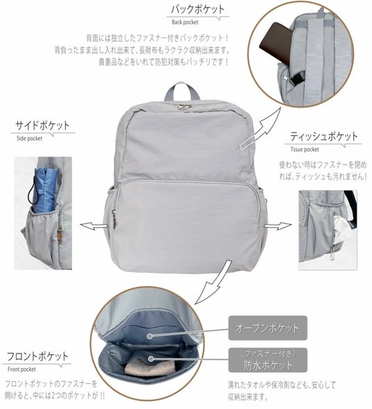リュック本体の外側には、傘やティッシュ、濡れたタオルなどを収納できるポケットが6つあります。背負ったまま出し入れができるバックポケットは防犯対策もバッチリ。フロントポケットを開けると、中にはさらにオープンポケットとファスナー付きの防水ポケットがあり、本体外側の両サイドにも出し入れのしやすいポケットがあります。