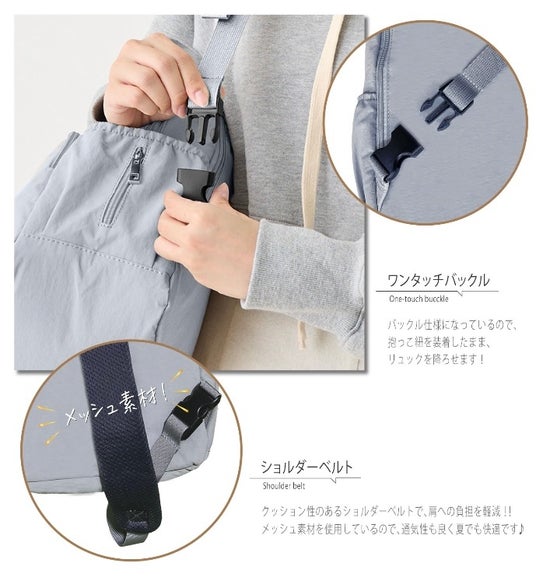 ショルダーベルトはクッション性があるメッシュ素材のため、肩への負担が軽減され、通気性も良く快適に使えます。ワンタッチバックルで抱っこ紐をしたままリュックを降ろせるのも嬉しいポイントです。