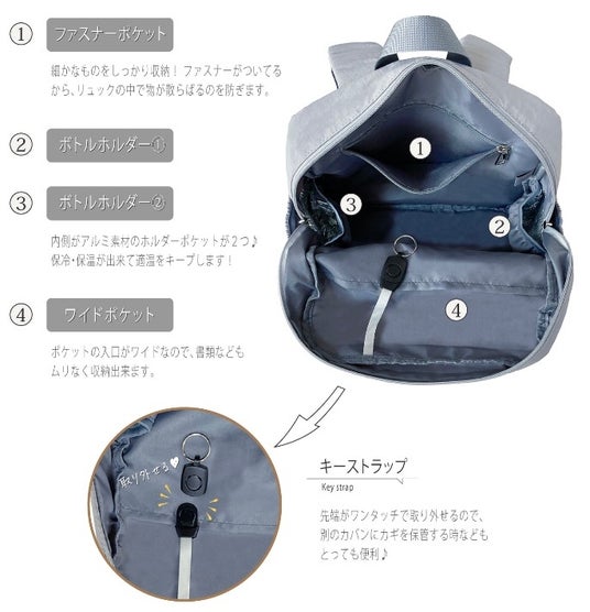 メイン収納の内側には、整理整頓がしやすい多様なポケットが4つあります。リュックの中で荷物が散らばる心配もファスナー付きのポケットがあるから安心。A4サイズもムリなく収納できるワイドポケット、両サイドには保冷保温ができるボトルホルダーがあります。
