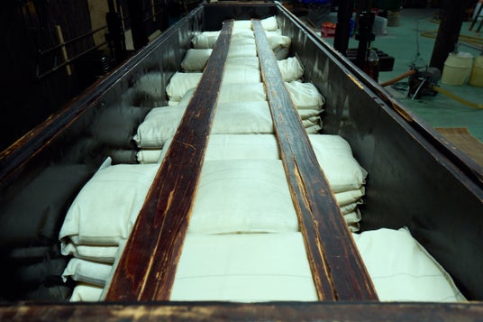 お酒の醪を詰めた酒袋を、槽(ふね)の中に一つ一つ丁寧に手積みする伝統的な「槽しぼり」