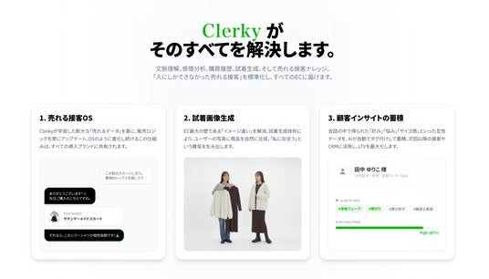オンライン購入における最大の不安要素である「実際に着たときのイメージが湧かない」という課題に対し、ClerkyはAI試着画像生成というアプローチで応えます。ユーザーが提供した写真に対して商品を自然に合成し、シルエットや雰囲気を視覚的に確認できる体験を提供します。