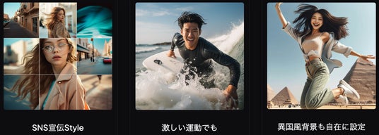 SNS投稿用の画像や実際には撮影が難しいシーンでも生成が可能です。例えば、宣伝したいサーフボードの商品画像1枚とご自身の顔の画像1枚を提供いただければ、ご自身がサーフボードを使ってサーフィンしているような画像を生成することができます。