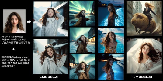 - もっと自由にこれまでの実際のモデルを使用した場合、契約に使用期間や使用地域、コラボ商品の選別などいろいろ細かく縛られることがありますが、「wModel.AI」なら、その悩みが解決できます。世界中どこでも、いつでも必要な画像を提供することが可能になります。
