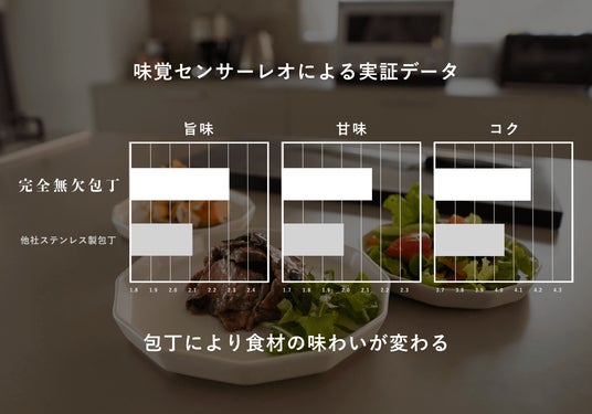 慶應義塾大学とAISSY株式会社が開発した味覚センサーレオにより、包丁による味わいの変化を科学的に分析。その結果、驚きの事実が判明しました。完全無欠包丁と中価格帯ステンレス包丁、2本の包丁によってトマトを切り、それぞれの味わいの変化を分析したところ、旨味は95%、甘味・コクは75%以上の人が気づくほど、味わいに優位な差が、完全無欠包丁によって現れることが証明されました。