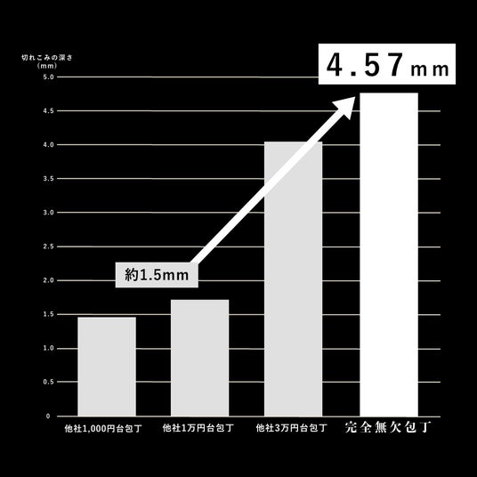 完全無欠包丁の切れ味を他社製品と比較試験したところ、切れ味の差が約3倍あり、同価格帯の他社包丁と比較してもそれを上回る切れ味があることが科学的に証明されています。