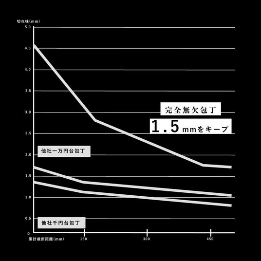 ※他社製の切れ味試験機による自社調査。新品の包丁による上下1cmの切断運動による試験紙の裁断距離を算出。