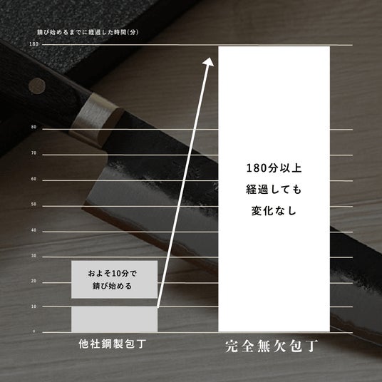 ※自社調査。同じ利用条件で鋼性の包丁と完全無包丁を用い放置した結果、錆が現れ始めるまでの時間を計測。