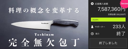 先行予約販売での目標達成率は2,529%、応援購入者数は233名を超え、過去の包丁プロジェクトと比較してもトップレベルの購入総額を達成し、大変大きな反響をいただきました。
